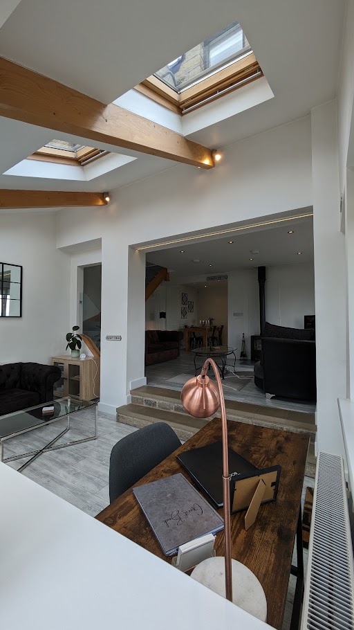 - Living area with TV, cuddle chair, sofa and log burning stove (Logs & Kindling provided)